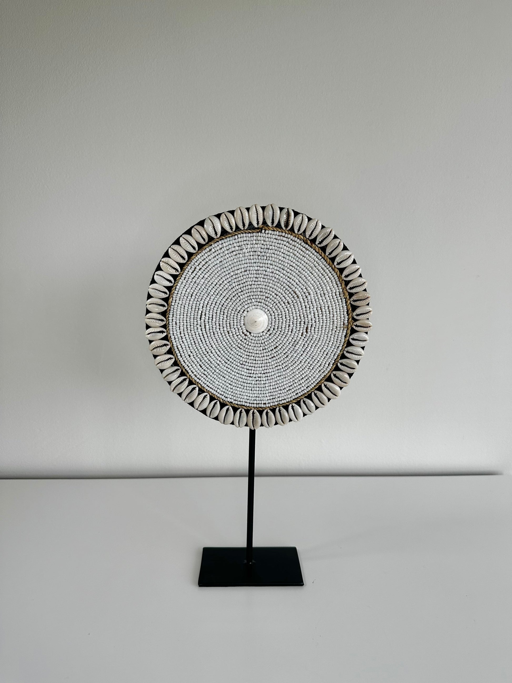 Het schelpenornament wordt geleverd met een zwarte metalen standaard, maar is los te halen van de standaard en kan dan opgehangen worden.